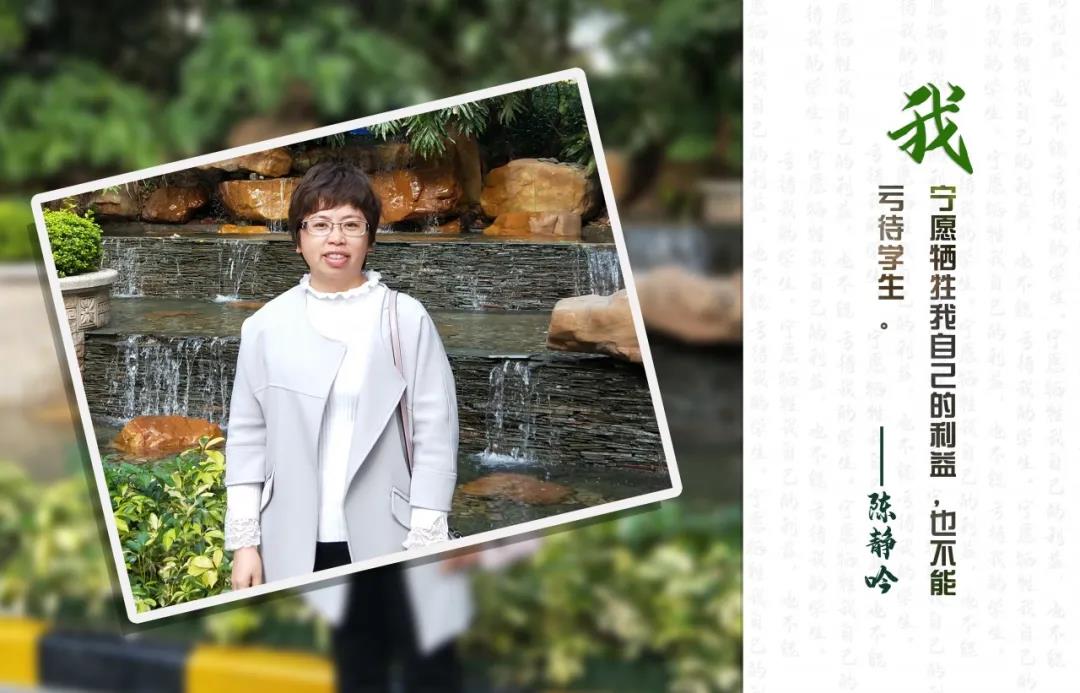為人師,從新鮮、探索到嫻熟、淡定,17年以來,陳靜吟細心呵護每一個學生,確保他們不受欺侮,確保他們擁有正確的人生觀;引導他們對自己負責,學會擔當并富有遠見;引導他們學會包容,擁有陽光的心理狀態;引導他們學會感恩,學會自律;引導他們刻苦上進,學會堅持;鼓勵他們戰勝困難,充滿自信;尊重他們,塑造健全的人格。