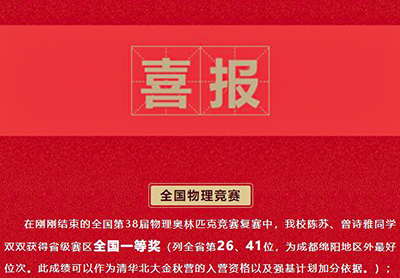 在剛剛結束的全國第38屆物理奧林匹克競賽復賽中,我校陳蘇、曾詩雅同學雙雙獲得省級賽區全國一等...