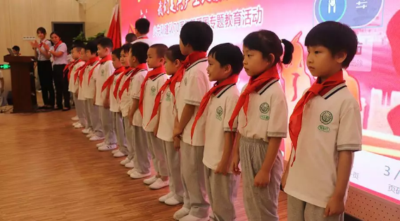 大隊輔導員宣布122名一年級小學生被批準加入中國少年先鋒隊,正式成為光榮的中國少年先鋒隊隊員,高年級的同學們做為老隊員為新隊員們佩戴上了鮮艷的紅領巾,當鮮艷的紅領巾佩帶在他們的胸前時,新隊員的臉上都洋溢著激動與自豪。