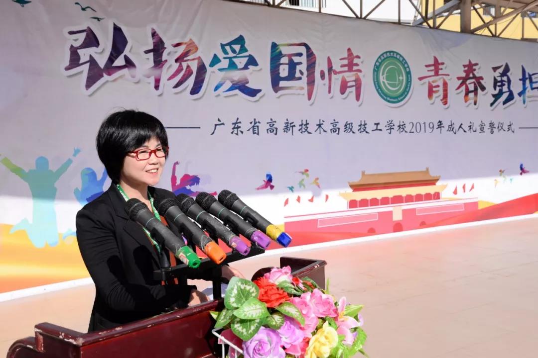 為本屆成人禮進行開禮致辭的是廣東省高新技術高級技工學校執行校長肖中圓,作為學校領導,她對來參加成人禮的各位家長、籌備本次活動的工作人員表示感謝,作為長者代表,她對莘莘學子寄予諄諄囑托和殷殷期待。