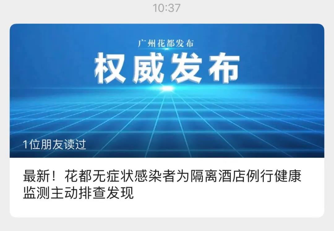 2020年10月16日中午12時許,廣州市花都區衛生健康局官微“健康花都”發布消息:花都區隔離酒店例行檢查發現1例境外輸入關聯無癥狀感染者。