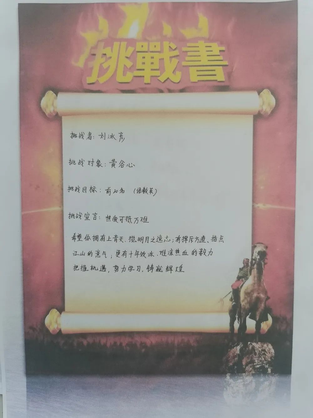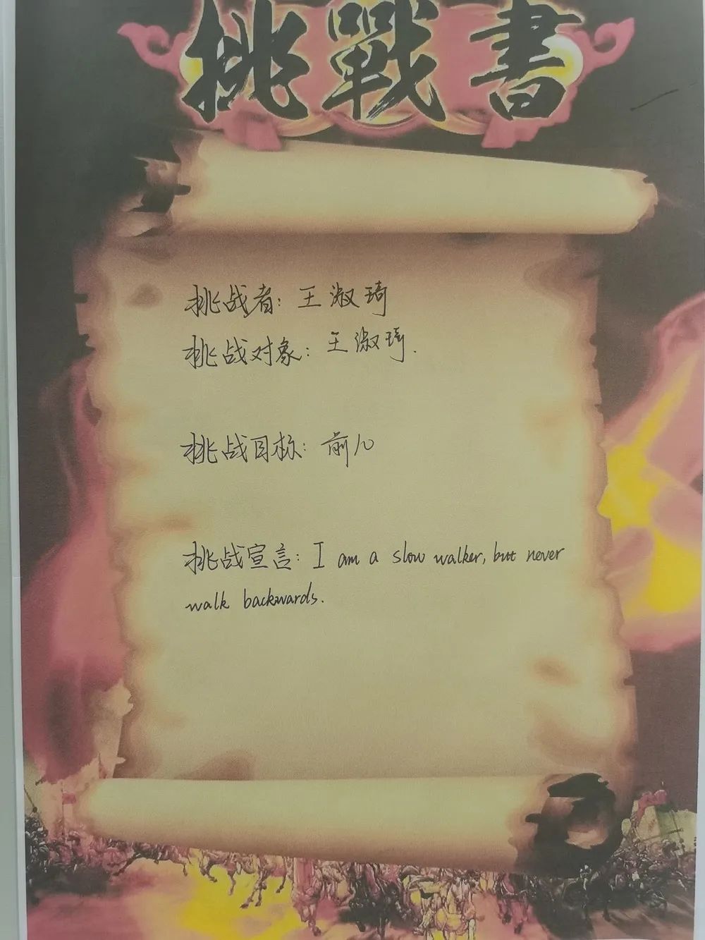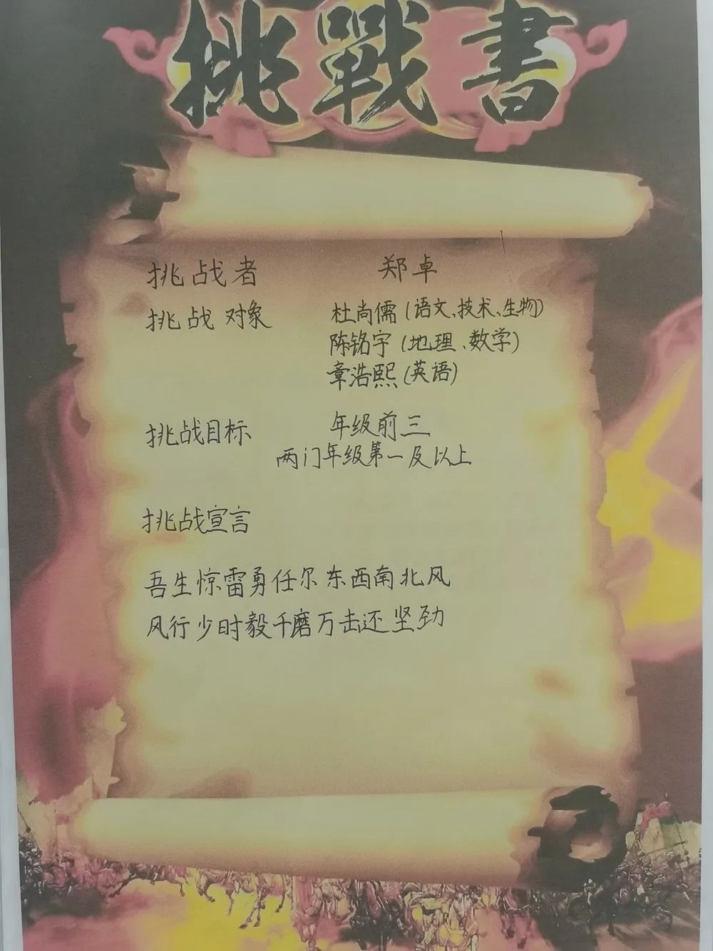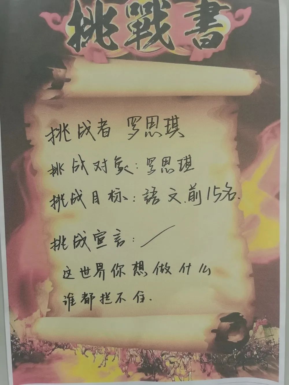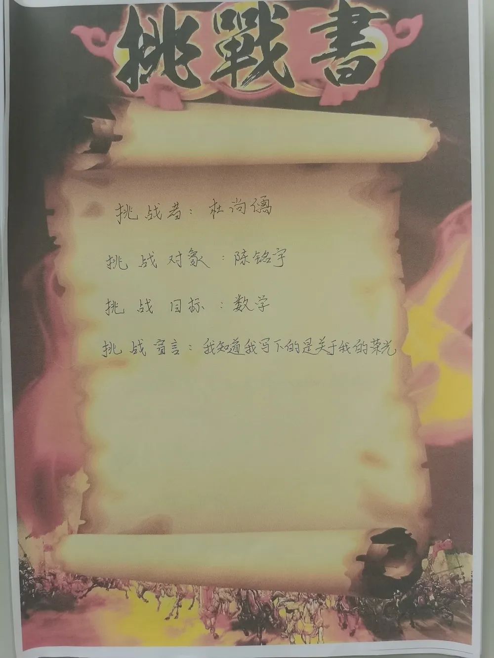最后全體學(xué)生激情寫下挑戰(zhàn)書并莊嚴(yán)宣誓,承諾珍惜學(xué)習(xí)時間,誠信考試。