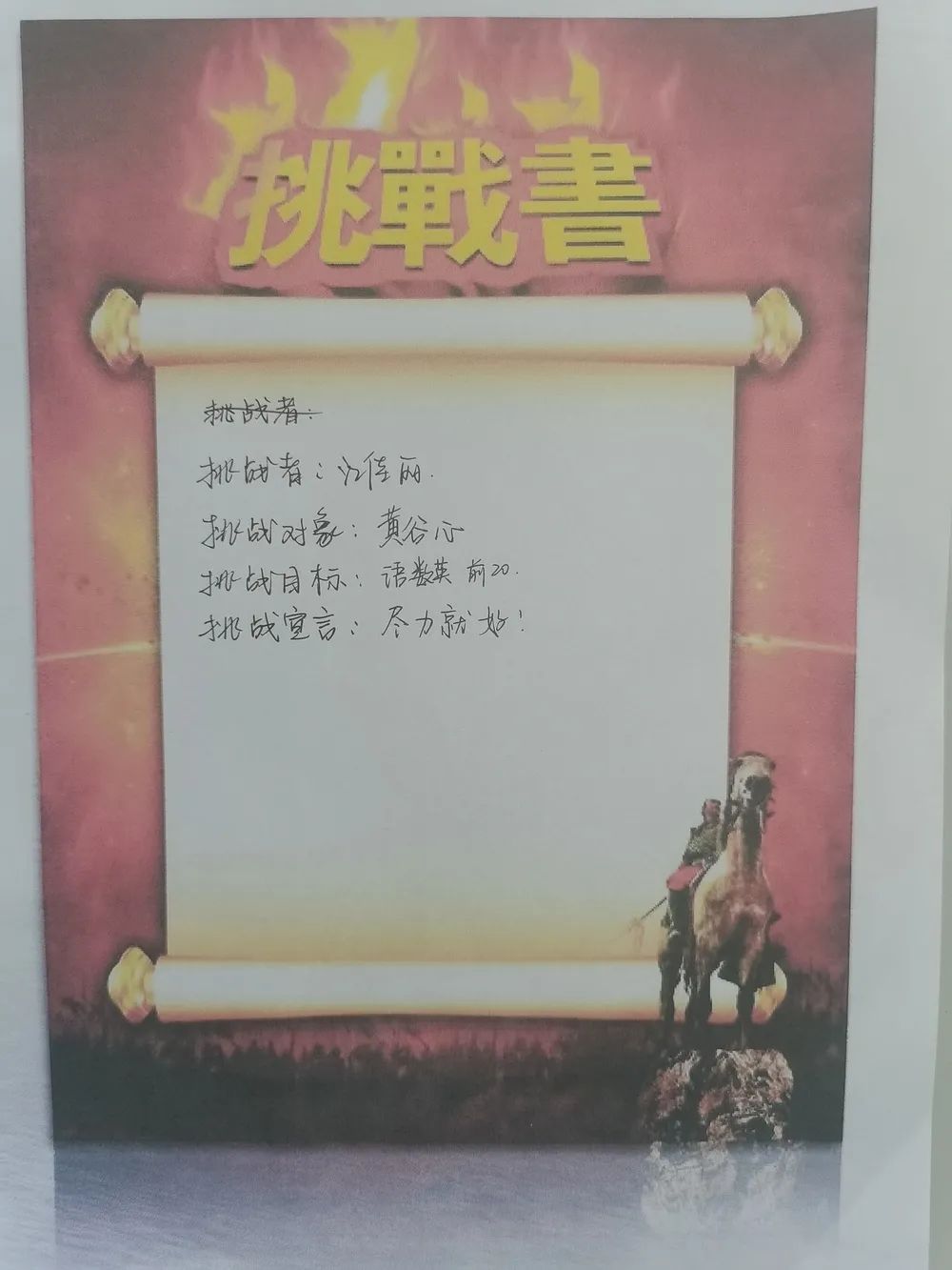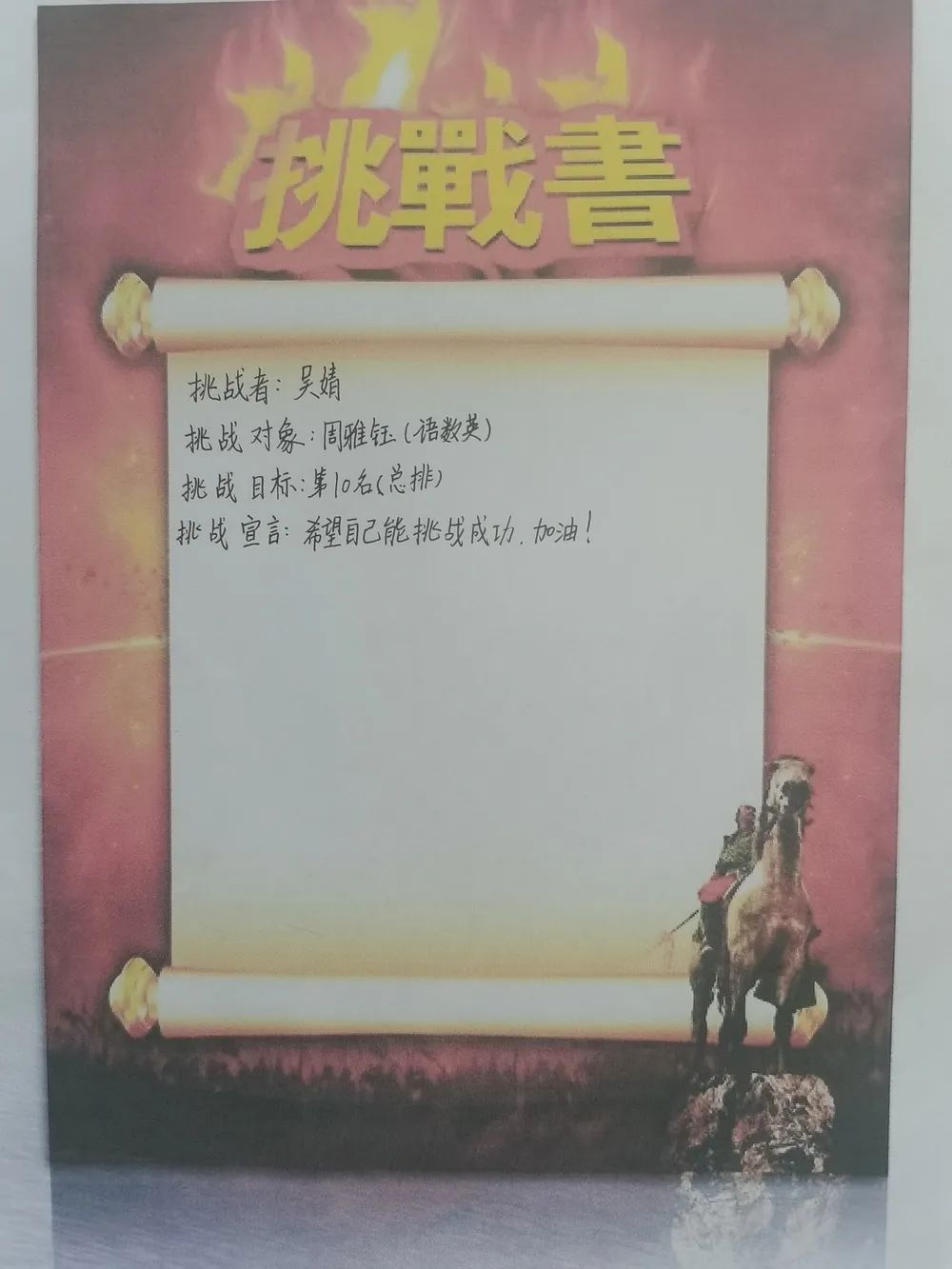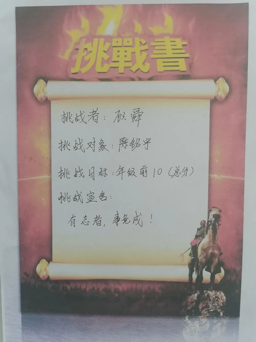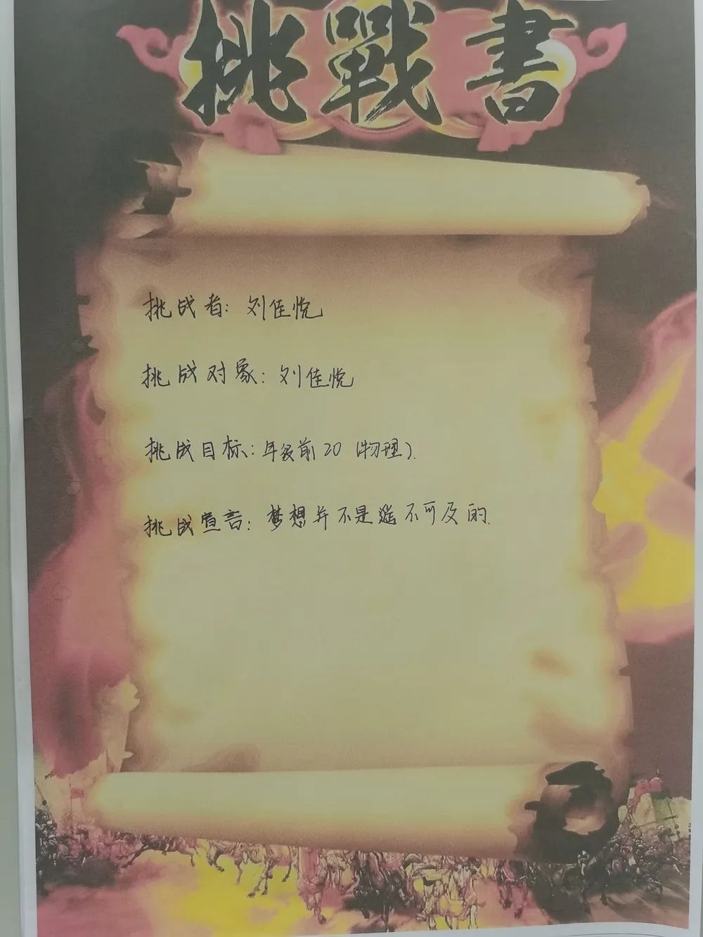 最后全體學(xué)生激情寫下挑戰(zhàn)書并莊嚴(yán)宣誓,承諾珍惜學(xué)習(xí)時間,誠信考試。