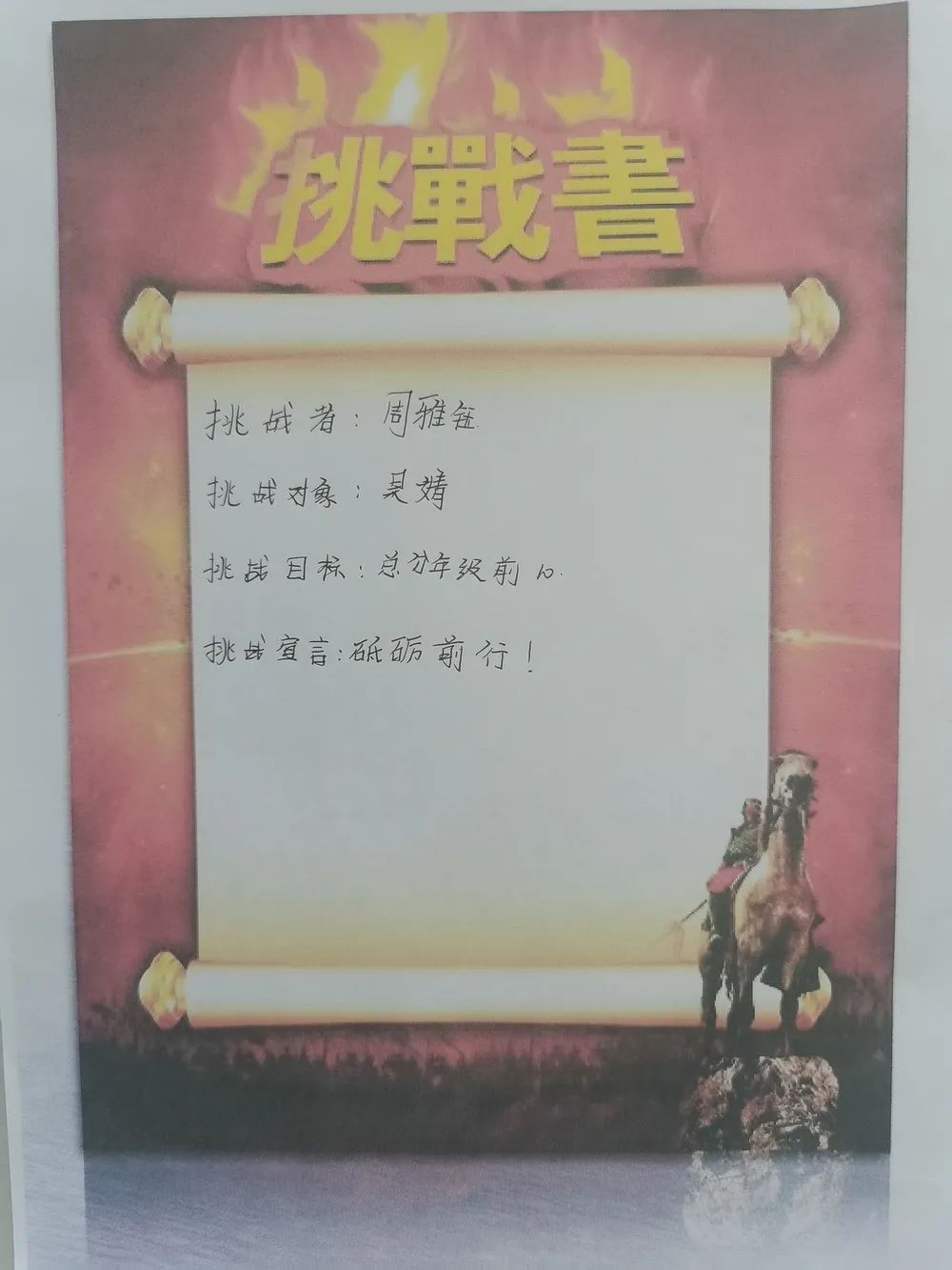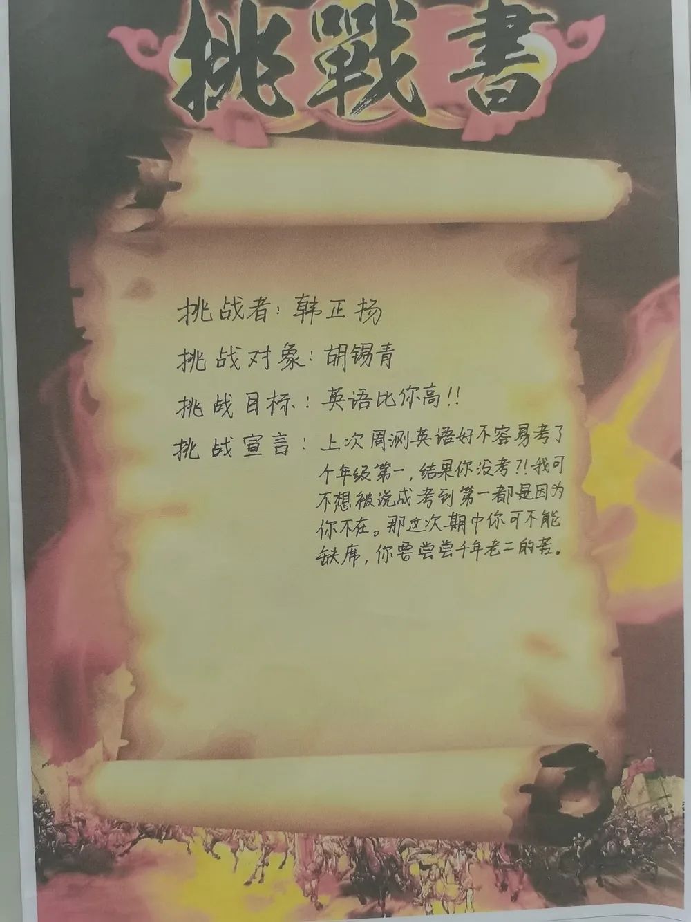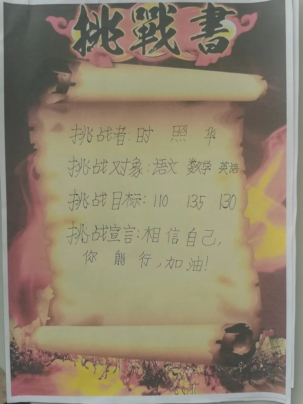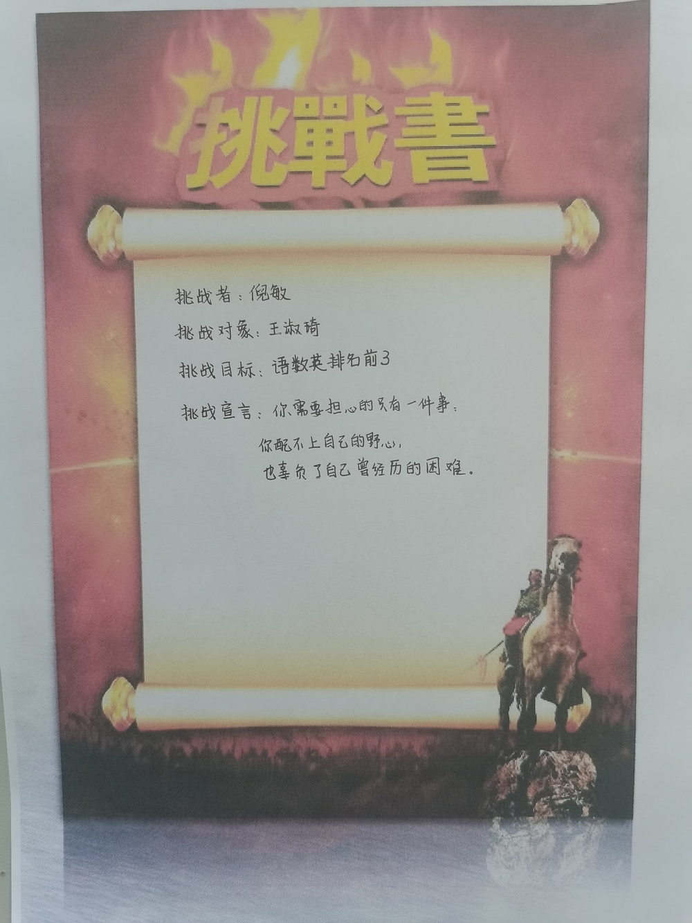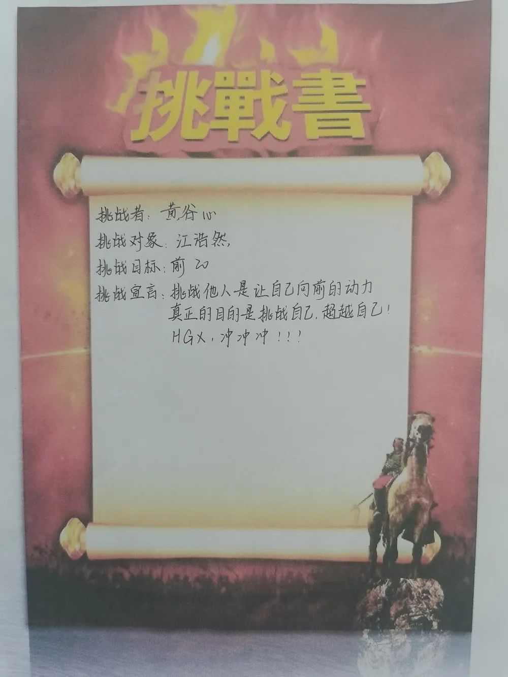 最后全體學(xué)生激情寫下挑戰(zhàn)書并莊嚴(yán)宣誓,承諾珍惜學(xué)習(xí)時間,誠信考試。